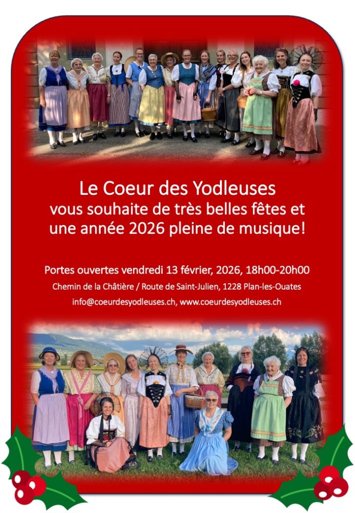 Portes ouvertes vendredi 13 février de 18h00 à 20h00; au Chemin de la Chatière 1 / Route de Saint-Julien, à Plan-les-Ouates. Participation gratuite sur inscription: info@coeurdesyodleuses.ch (Veuillez noter que c’est orthographié “coeur” et “yodleuses” et pas choeur / yodeleuses!)